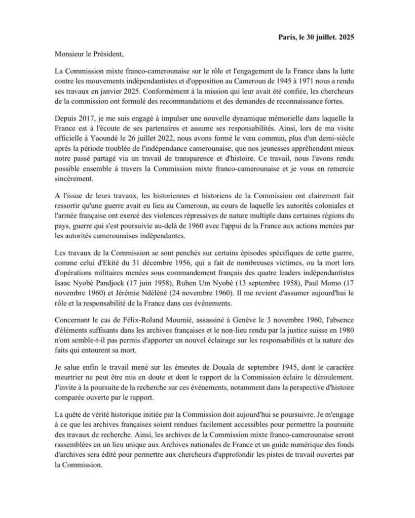 Le ministère français des Affaires étrangères vient de publier une lettre du président Emmanuel Macron adressée au président Paul Biya, datée du 30 juillet 2025.